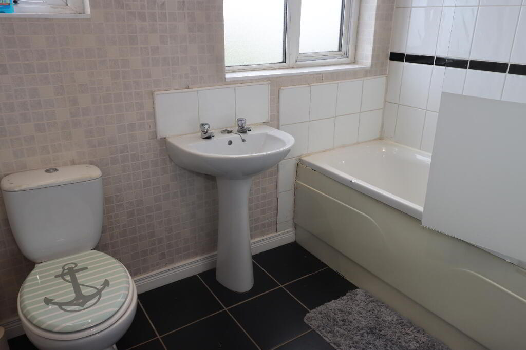 BATHROOM White suite comprising panelled bath with shower screen, pedestal wash hand basin, low flush WC, downlighters