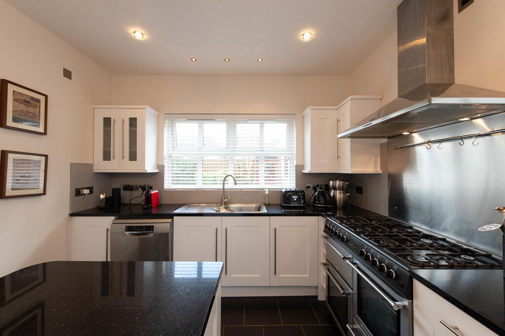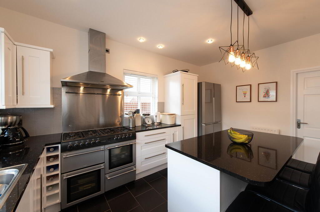 KITCHEN 14' 6" x 10' 5" (4.42m x 3.18m) Range of high and low level units, granite worksurfaces, stainless steel extractor fan, breakfast bar, wine rack, dishwasher, display units, downlighters