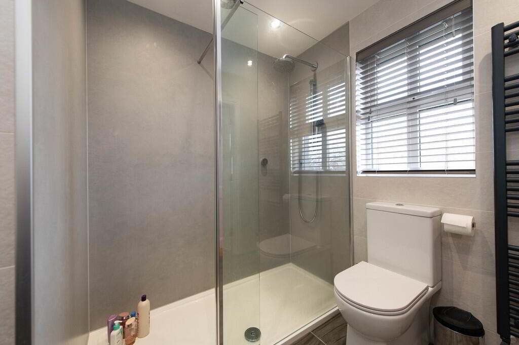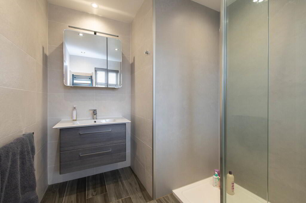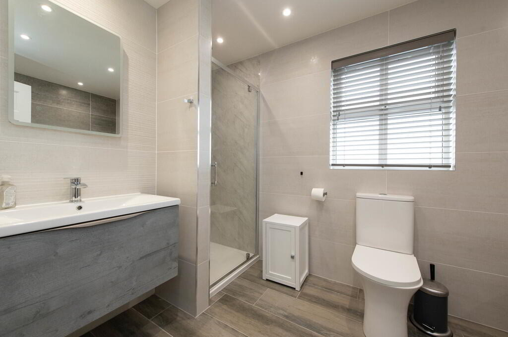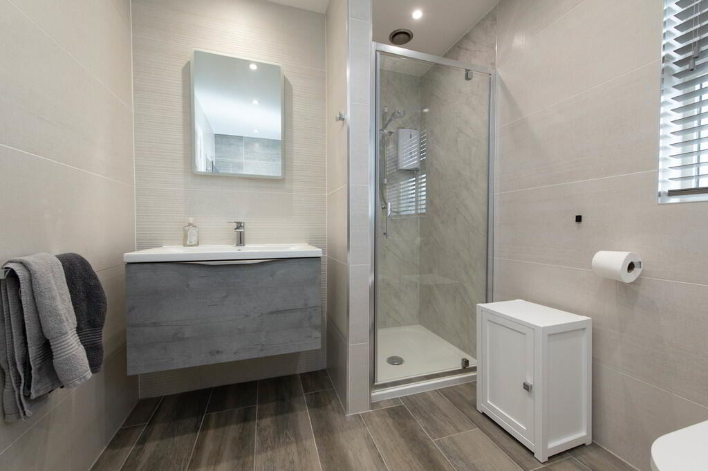 ENSUITE Low flush W/C, wall hung vanity unit, shower unit with controlled shower, overhead rain shower, extractor fan, downlighters, ceramic tiled flooring, heated towel rail