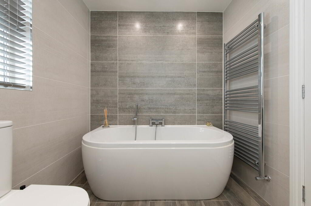 BATHROOM White suite panelled bath with mixer tap, telephone hand shower, wall hung vanity unit, ceramic tiled flooring, shower unit with controlled shower, extractor fan, downlighters, heated towel rail