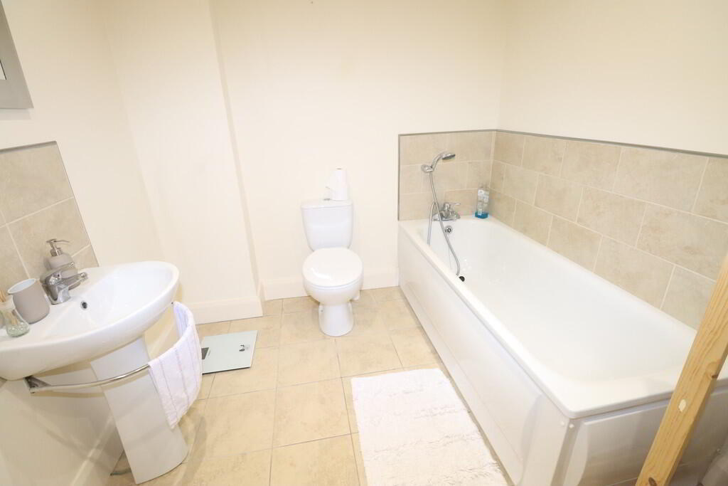 BATHROOM Modern white bathroom suite comprising panelled bath, telephone hand shower, low flush W/C, pedestal wash hand basin, wall tiling, ceramic tiled flooring, downlighters, extractor fan