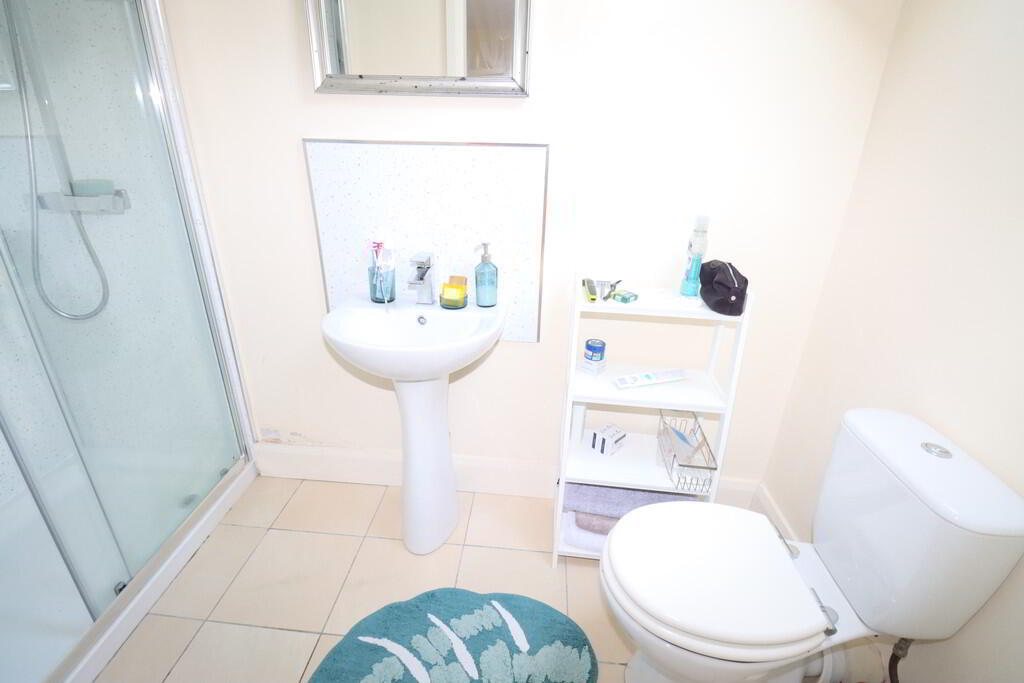 ENSUITE Glazed shower cubicle with thermostatic controlled shower, low flush W/C, pedestal wash hand basin, PVC wall panelling, ceramic tiled flooring, extractor fan, Velux window