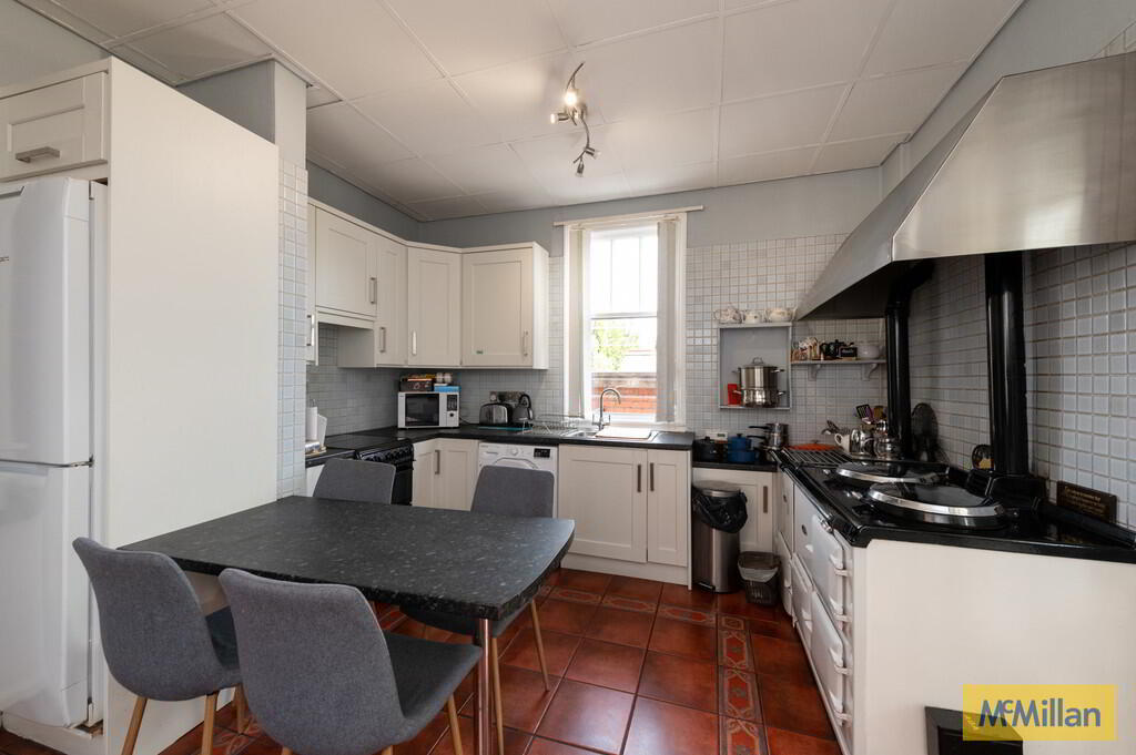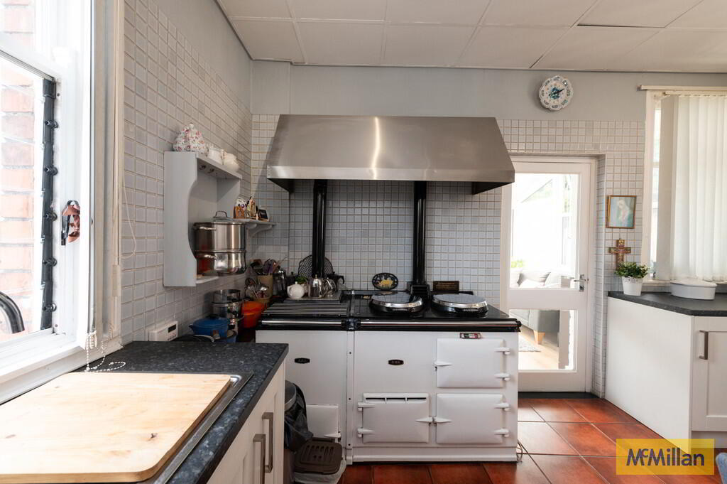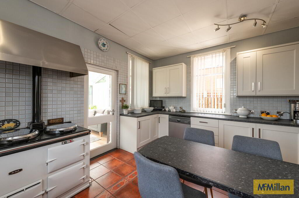KITCHEN 18' 9" x 14' 7" (5.72m x 4.44m) Modern fitted kitchen with range of high and low level units, round edge worksurfaces, stainless steel sink unit with mixer tap and vegetable sink, space for oven, Agamatic boiler, Aga range cooker, plumbed for dishwasher, tiling, plumbed for washing machine, space for fridge freezer, ceramic tiled flooring, Casual dining area