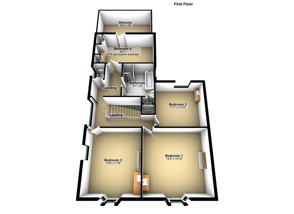 BEDROOM (4) 14' 8" x 8' 11" (4.47m x 2.72m) Built in cupboards, door to Veranda, original ornate fireplace, cornicing