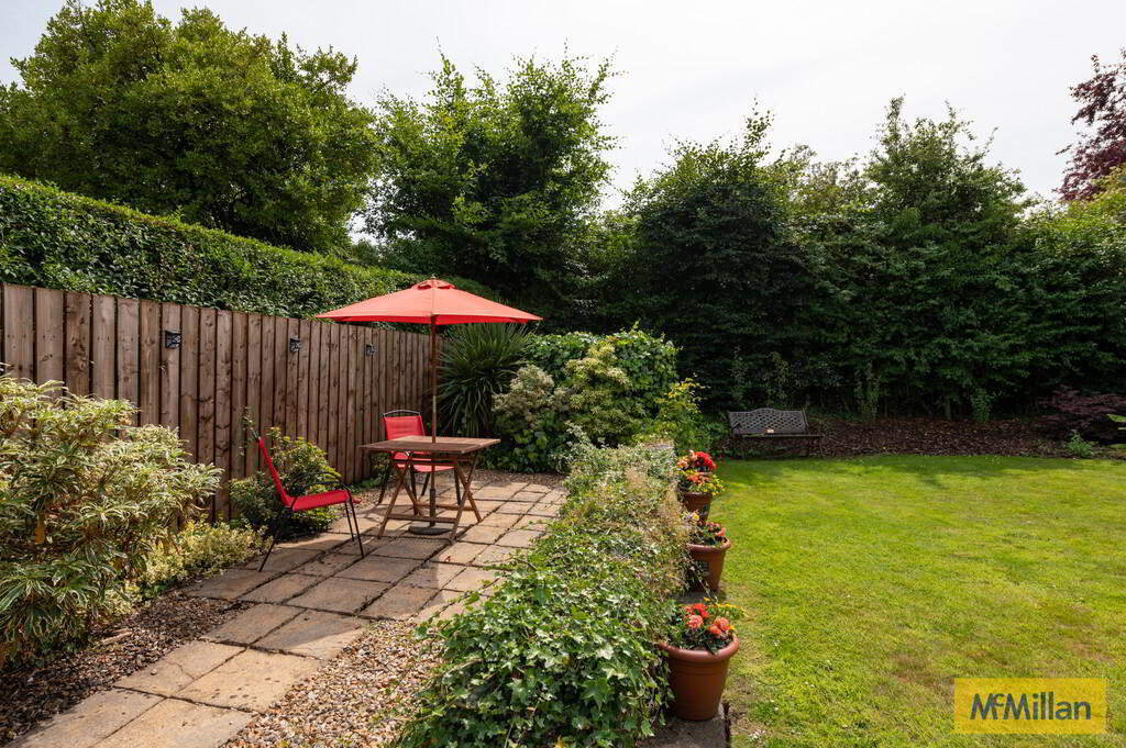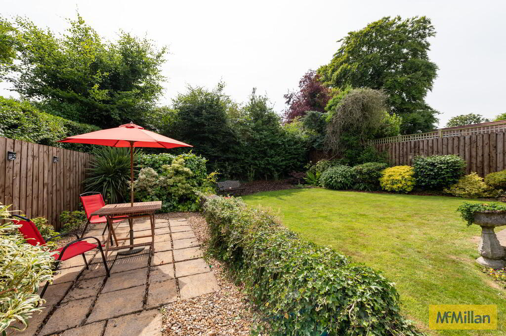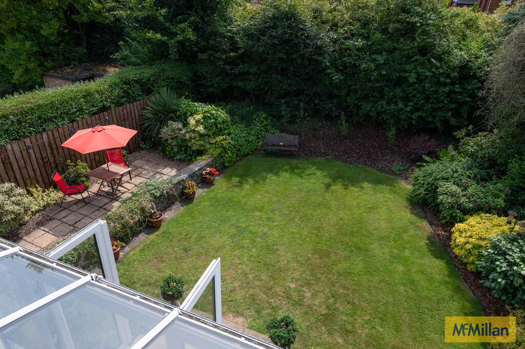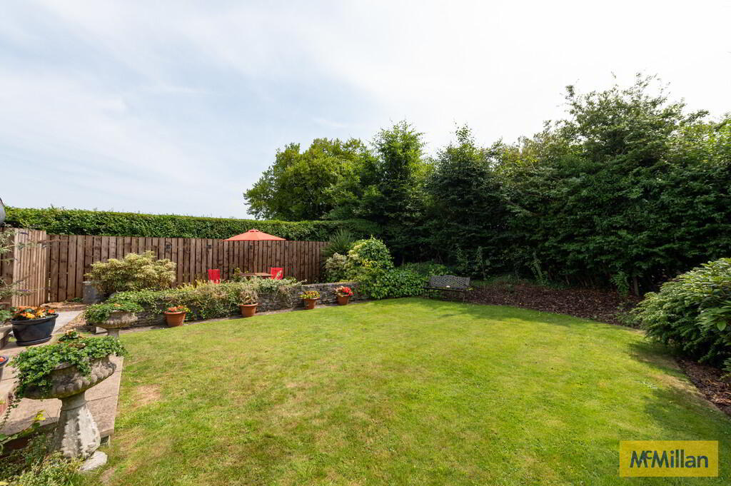 Rear: in mature private lawn, mature plants and shrubs, uPVC oil storage tank