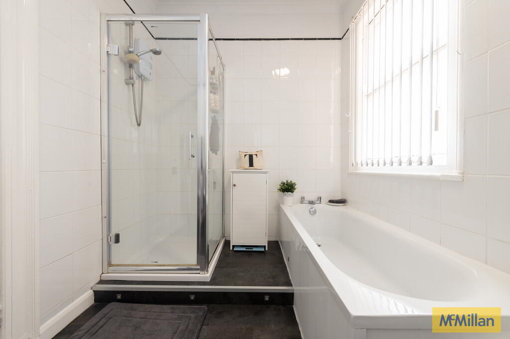 BATHROOM Modern white bathroom suite, panelled bath with mixer tap, vanity unit with mixer tap, walk in shower unit with electric shower, heated towel rail, separate W/C, hot press with insulated copper cylinder