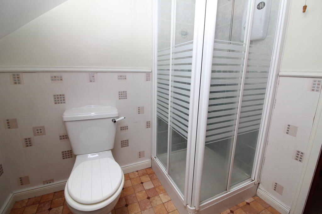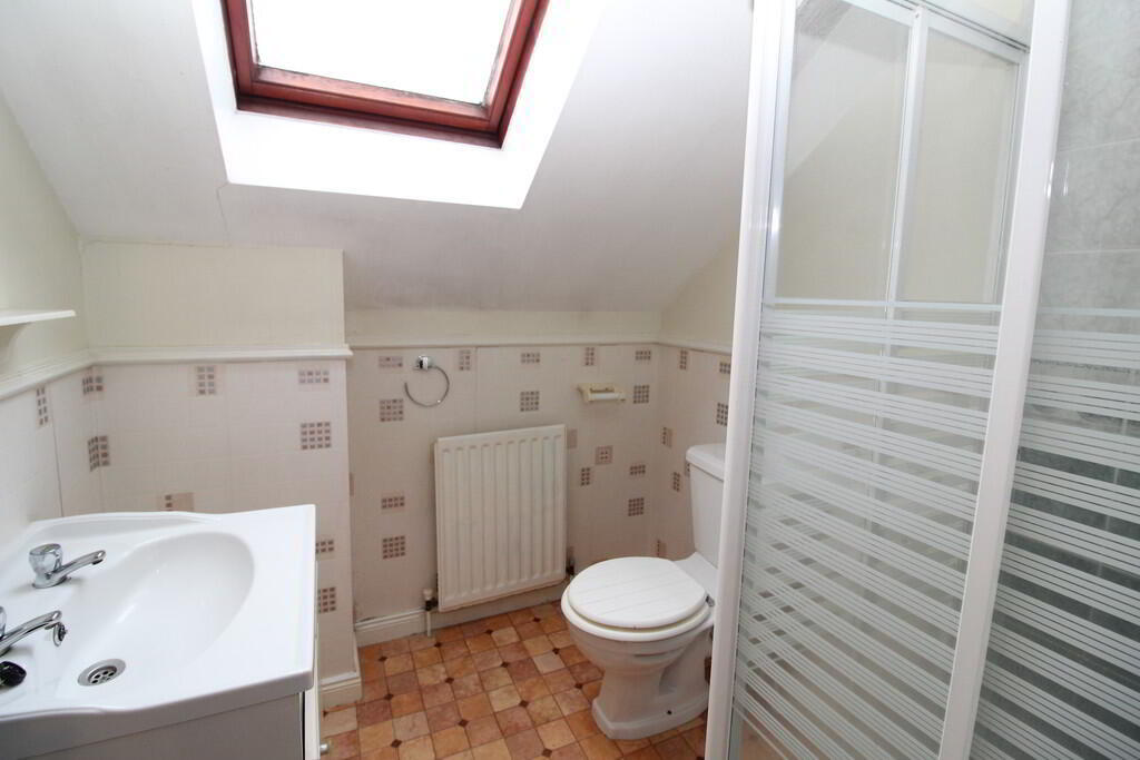 SHOWER ROOM White 3 piece suite with low flush WC, fully tiled shower enclosure with electric shower unit and wash hand basin with underbench storage. Velux window, extractor fan.