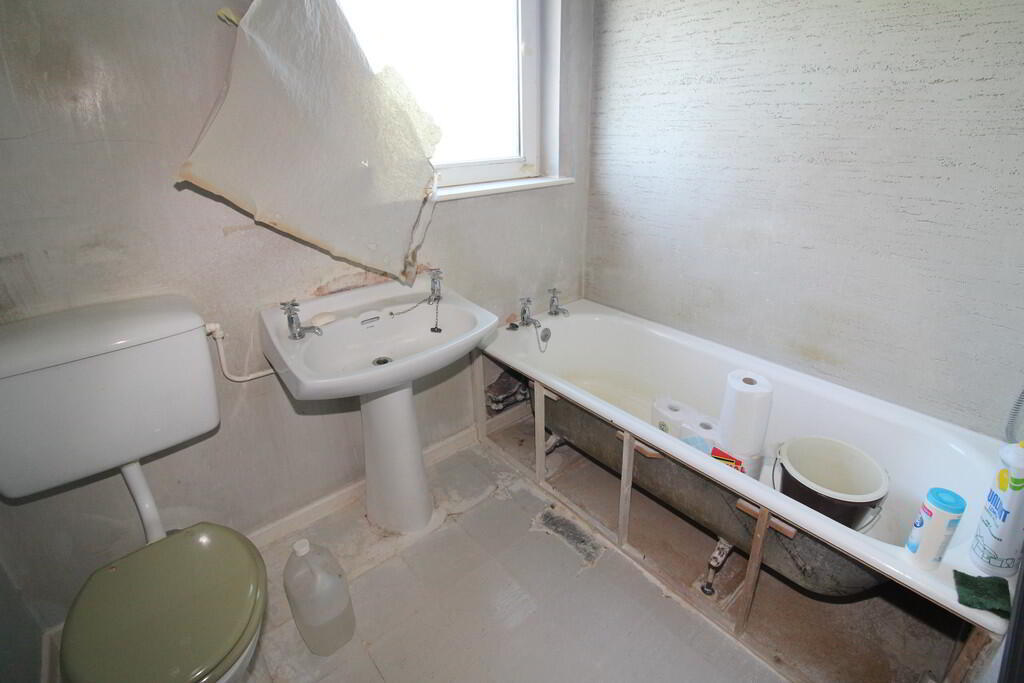 BATHROOM Bath with chrome mixer tap and shower attachment. Pedestal wash hand basin. Low flush WC with coloured suite.