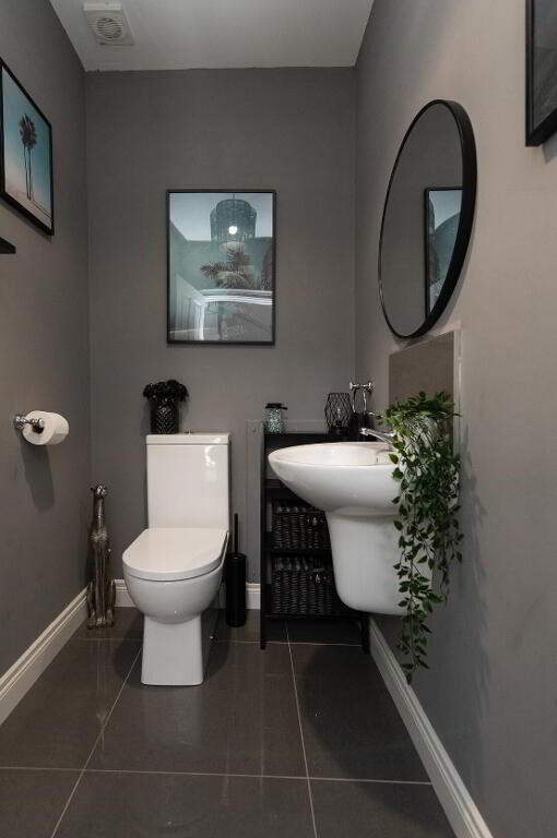 CLOAKS Low flush W/C, half pedestal wash hand basin, tiled splashback, polished porcelain tiled flooring, extractor fan