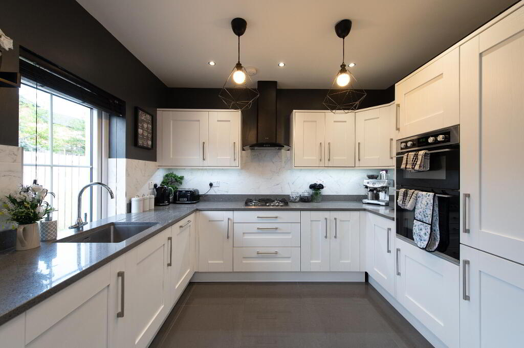 KITCHEN 19' 0" x 10'5 (at max) or 7'7 (at min) (5.79m x 2.31m) Range of high and low level shaker style units, granite worksurfaces, built in double oven and gas hob unit, extractor fan and canopy, integrated fridge freezer, integrated dishwasher, wall tiling, polished porcelain tiled flooring.
