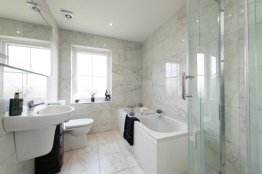 BATHROOM Modern white suite comprising panelled bath, glazed shower cubicle with thermostatic controlled shower, low flush W/C, half pedestal wash hand basin, wall tiling, ceramic tiled flooring, downlighters, extractor fan