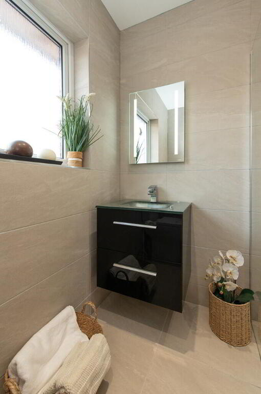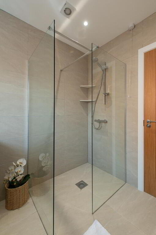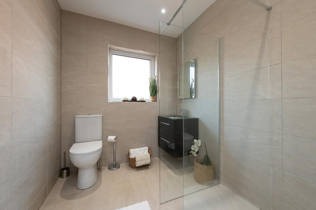SHOWERROOM Luxury glazed shower with mixer tap. Low flush WC. Wall hung vanity unit. Extractor fan. Luxury wall and floor tiling.