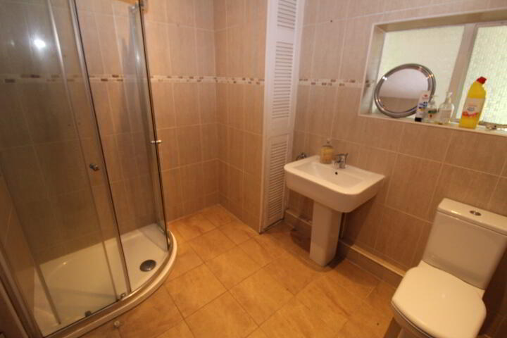 SHOWERROOM Modern shower room comprising glazed shower cubicle with thermostatically controlled shower, low flush WC, pedestal wash hand basin, chrome heated towel rail, tiled walls, ceramic tiled flooring, downlighters, hot press
