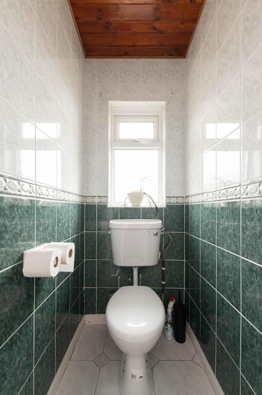 SEPARATE W/C Low flush W/C, fully tiled walls, ceramic tiled flooring, pine panelled ceiling
