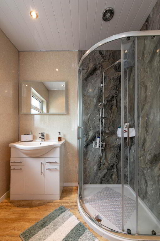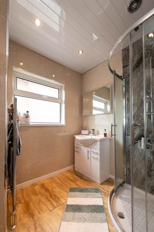 SHOWER ROOM Glazed shower cubicle with feature rainfall shower and separate hand held shower, vanity unit sink, PVC panelled walls and ceiling, downlighters, extractor fan, chrome heated towel rail, Worcester gas fired boiler, downlighters