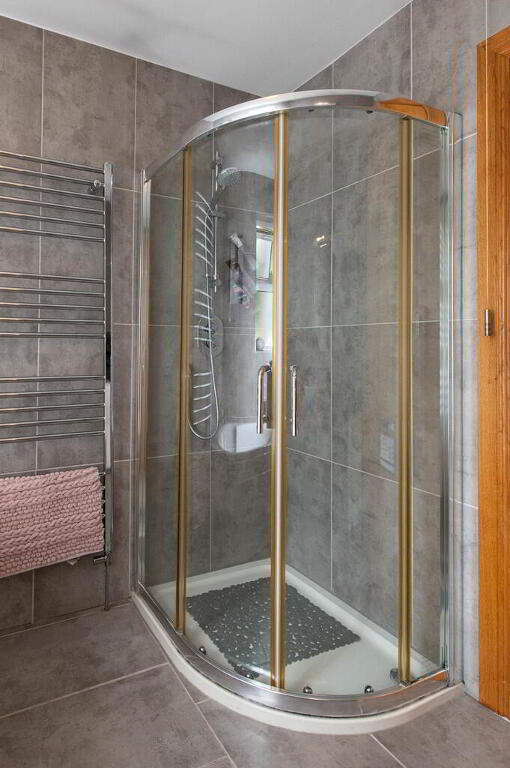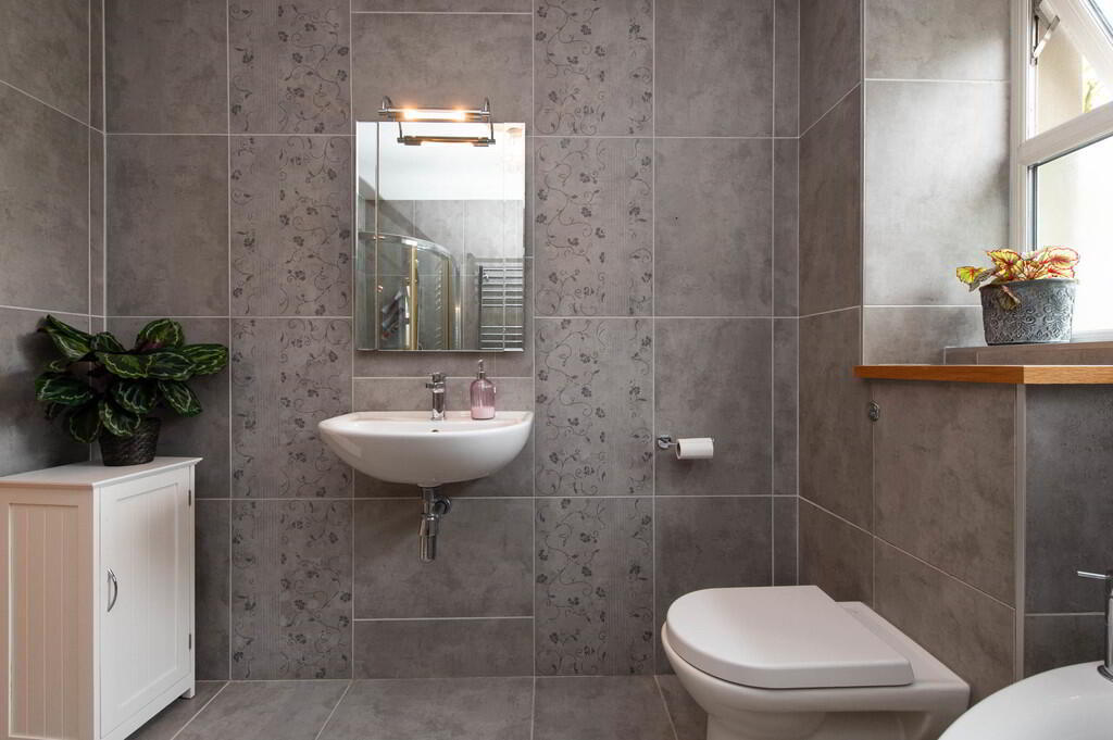 BATHROOM White suite, corner bath with mixer tap, low flush W/C, shower unit, wash hand basin, ceramic tiled flooring, fully tiled walls, heated towel rail