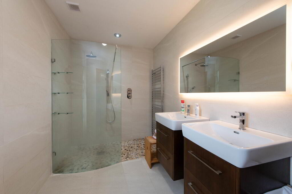 ENSUITE SHOWER ROOM Vanity unit, low flush W/C, shower unit with controlled shower, and overhead rain shower, ceramic tiled flooring, fully tiled walls, feature mirror, heated towel rail