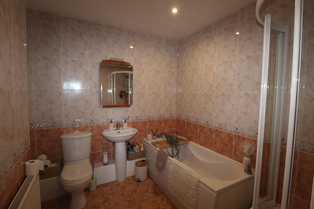 BATHROOM White suite, panelled bath with mixer tap, telephone hand shower, low flush W/c, pedestal wash hand basin, ceramic tiled flooring, shower unit with electric shower, downlighters, extractor fan