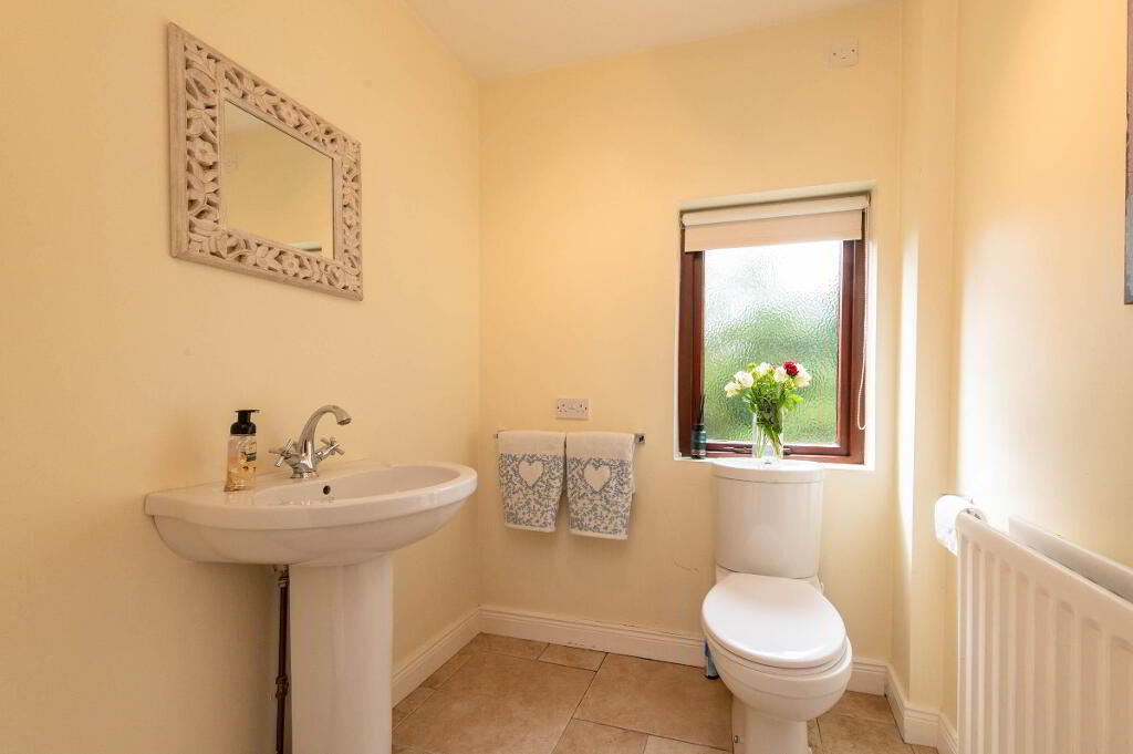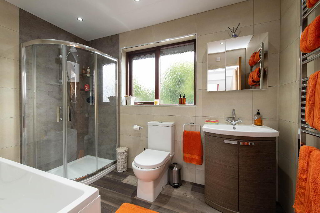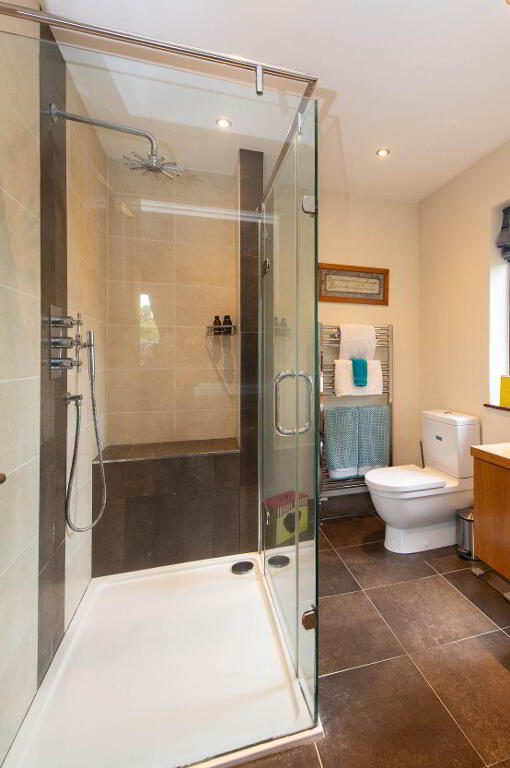 ENSUITE Low flush W/C, large shower unit with rain shower, large sink with mixer tap, heated towel rail, ceramic tiled flooring, downlighters