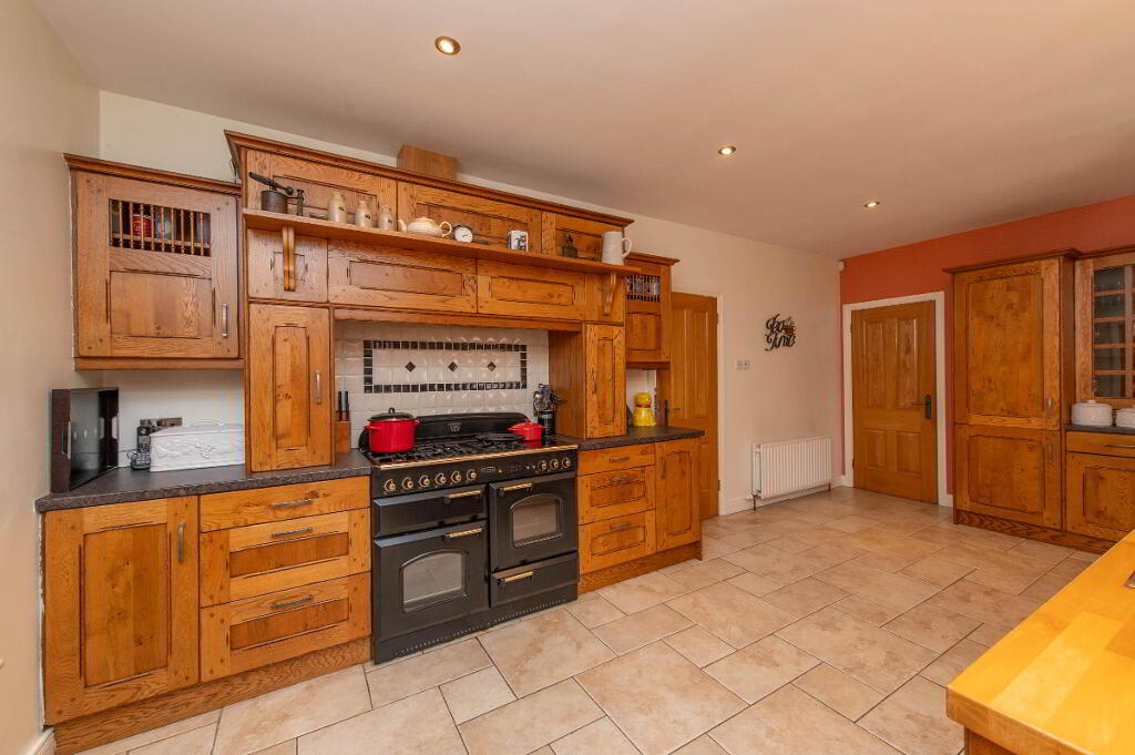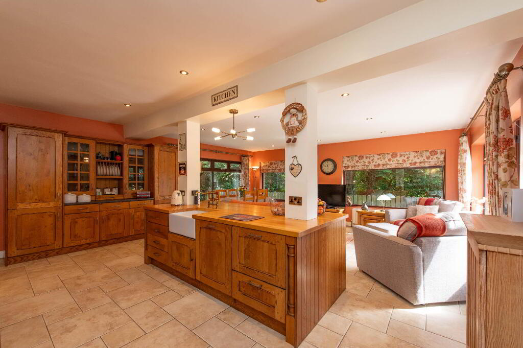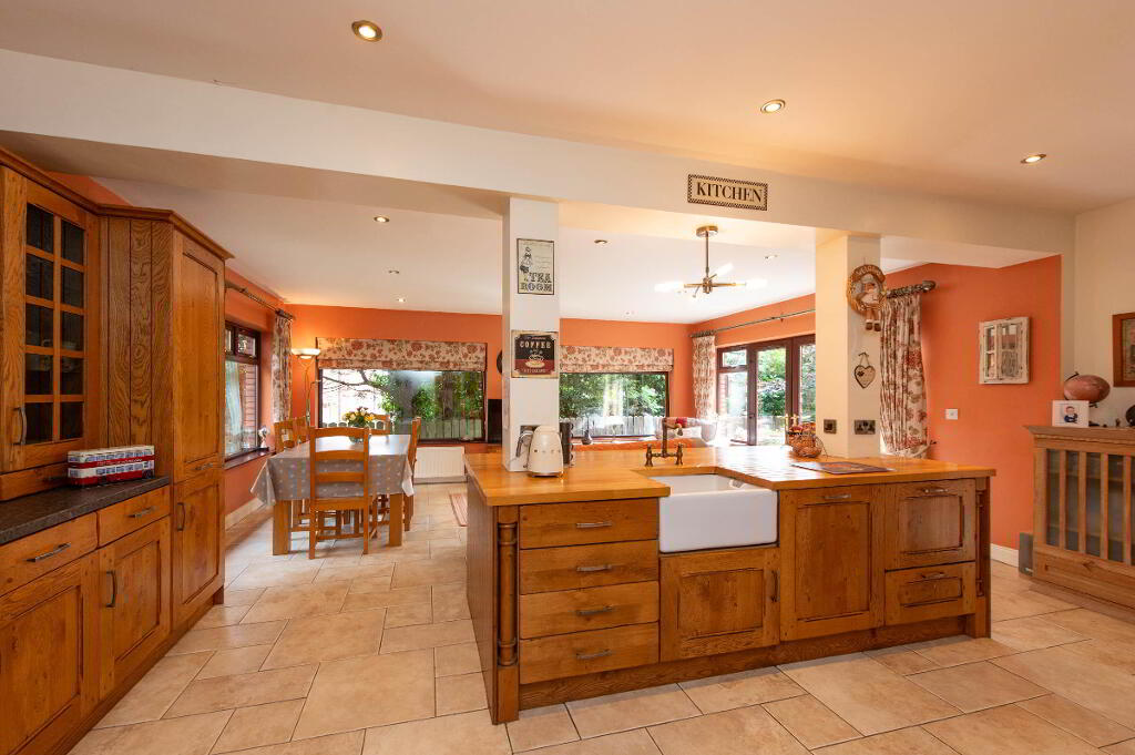 KITCHEN 24' 6" x 19' 10" (7.47m x 6.05m) Luxury fitted kitchen with range of high and low level units, round edge worksurfaces, space for Range cooker, extractor fan, island unit with Belfast sink with mixer tap and solid wood worksurfaces, built in dishwasher, built in fridge and freezer, ceramic tiled flooring, downlighters, dresser.