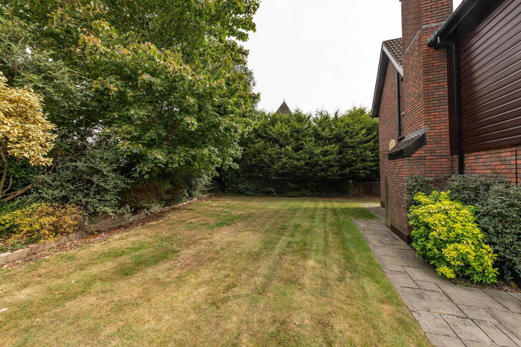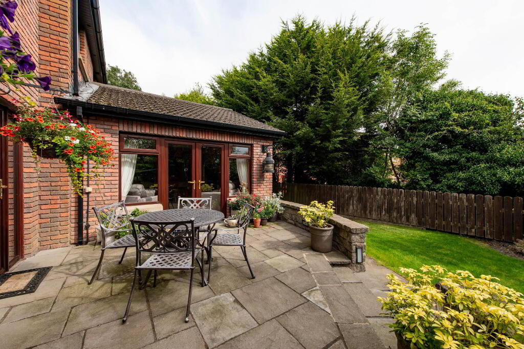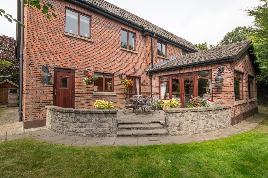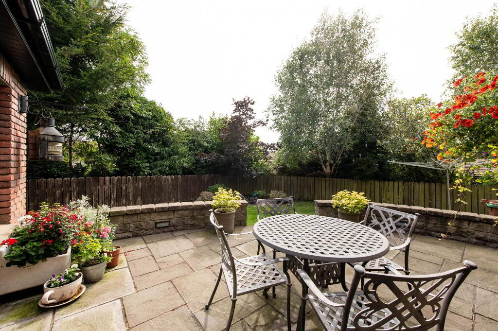 Rear in lawn, paved patio area, plants, trees and shrubs, water feature