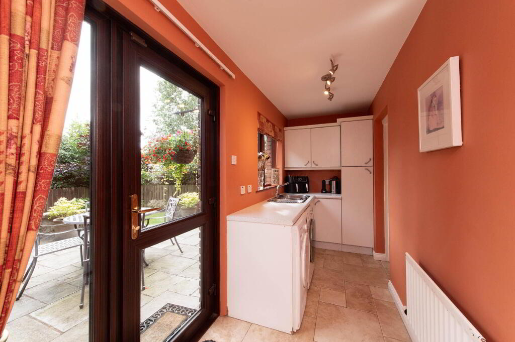 UTILITY ROOM 13' 0" x 4' 10" (3.96m x 1.47m) Range of units, stainless steel sink unit with mixer tap and vegetable sink, plumbed for washing machine, space for tumble dryer, downlighters, ceramic tiled flooring, uPVC door to side, door to garage.