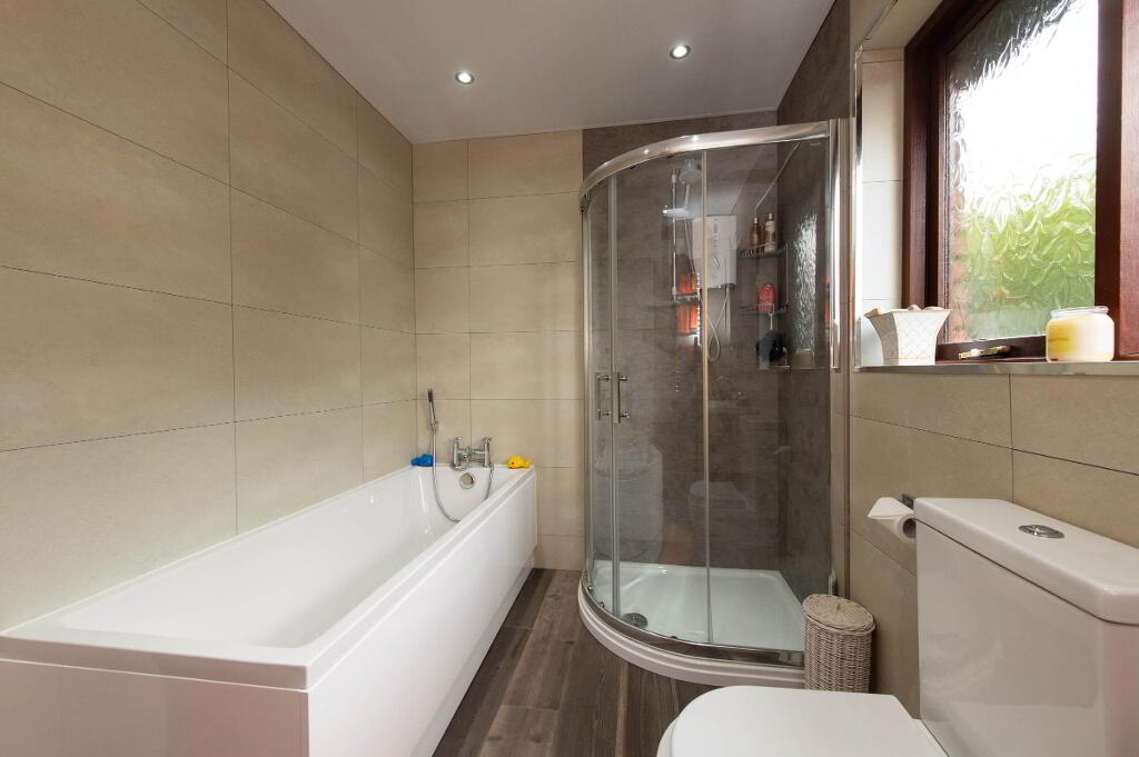 BATHROOM Modern white bathroom suite, low flush W/C, vanity unit sink with mixer tap, panelled bath with mixer tap, corner glazed shower unit with electric shower, uPVC tiling, heated towel rail, downlighters