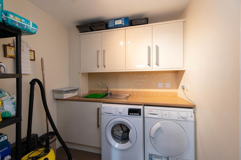 UTILITY ROOM 8' 10" x 7' 0" (2.69m x 2.13m) Range of units, stainless steel sink unit with mixer tap, plumbed for washing machine, space for tumble dryer, ceramic tiled flooring, tiling
