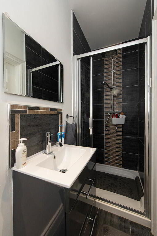 ENSUITE SHOWER ROOM Low flush W/C, vanity unit with twin drawers, glazed shower unit with controlled shower, tiling, ceramic tiled flooring