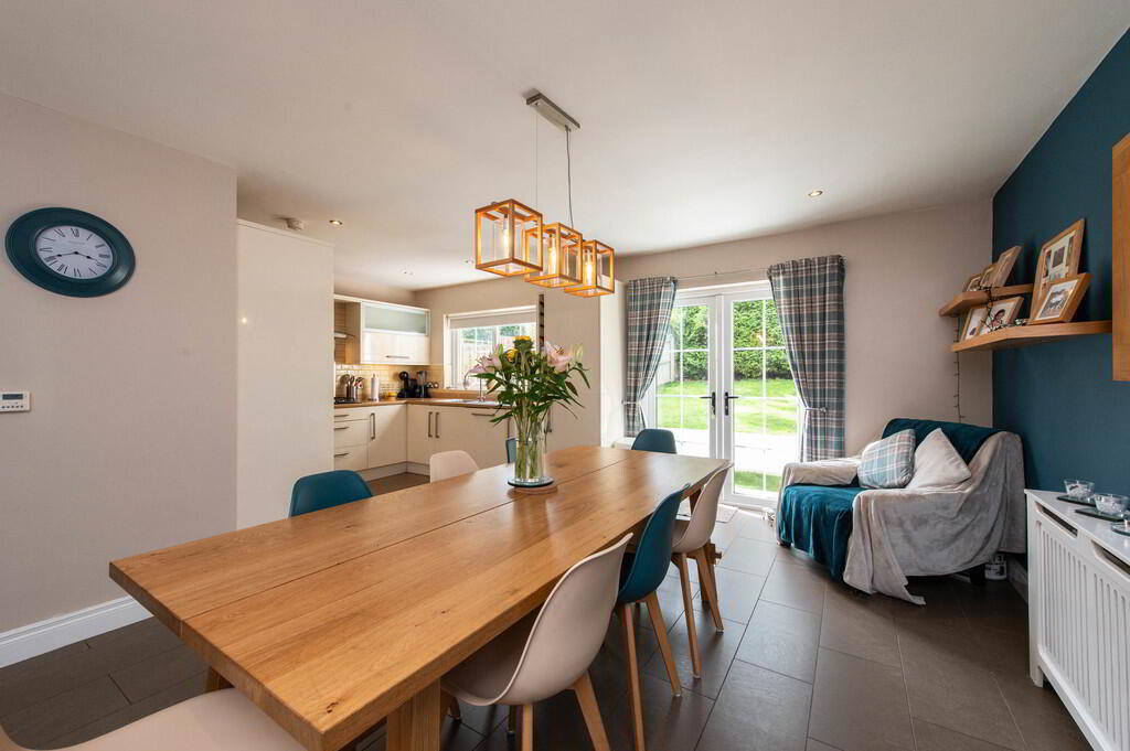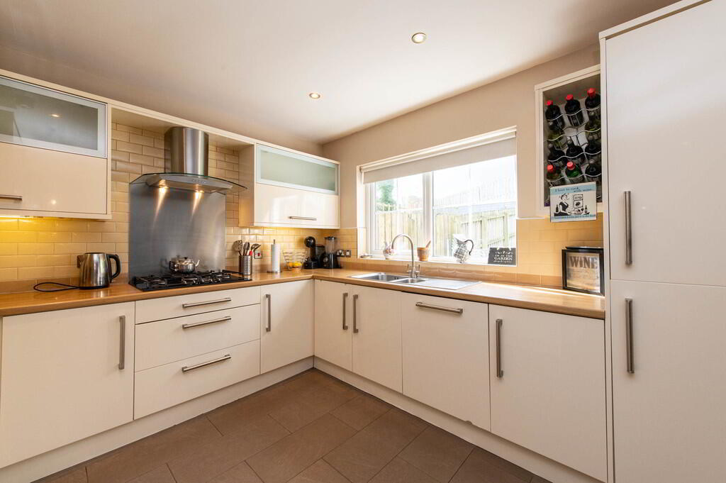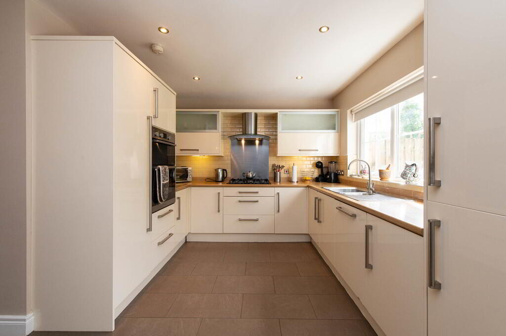 KITCHEN 17' 5" x 19' 10" (at max) or 12'5 (at min)(5.31m x 6.05m) Modern fitted kitchen with range of high and low level units, round edge worksurfaces, stainless steel sink unit with mixer tap and vegetable sink, built in double oven, built in fridge freezer, built in dishwasher, tiling, 5 ring gas hob, stainless steel extractor fan, two pull out larders, ceramic tiled flooring.