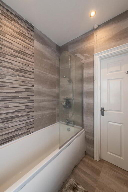 BATHROOM White bathroom suite, low flush W/C, wall hung vanity unit with mixer tap, panelled bath with mixer tap, controlled shower, glazed shower screen, heated towel rail, full tiled