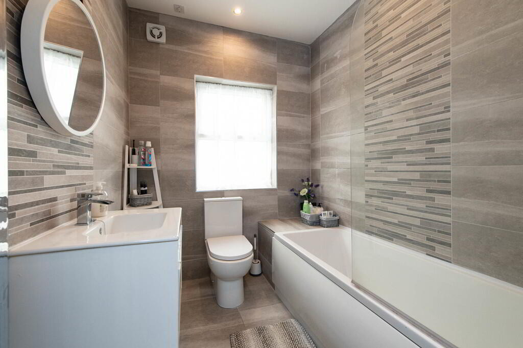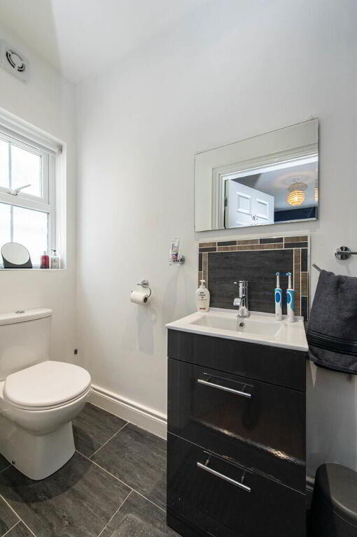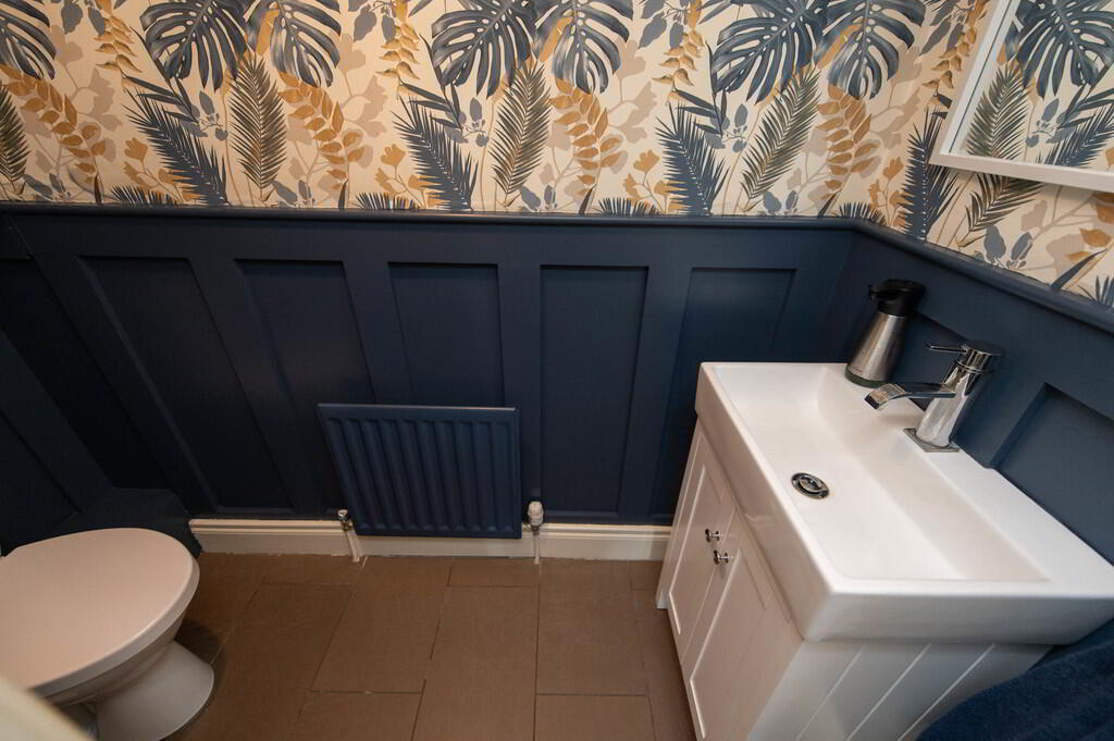 CLOAKS Low flush W/C, vanity unit with mixer tap, feature panelling, extractor fan