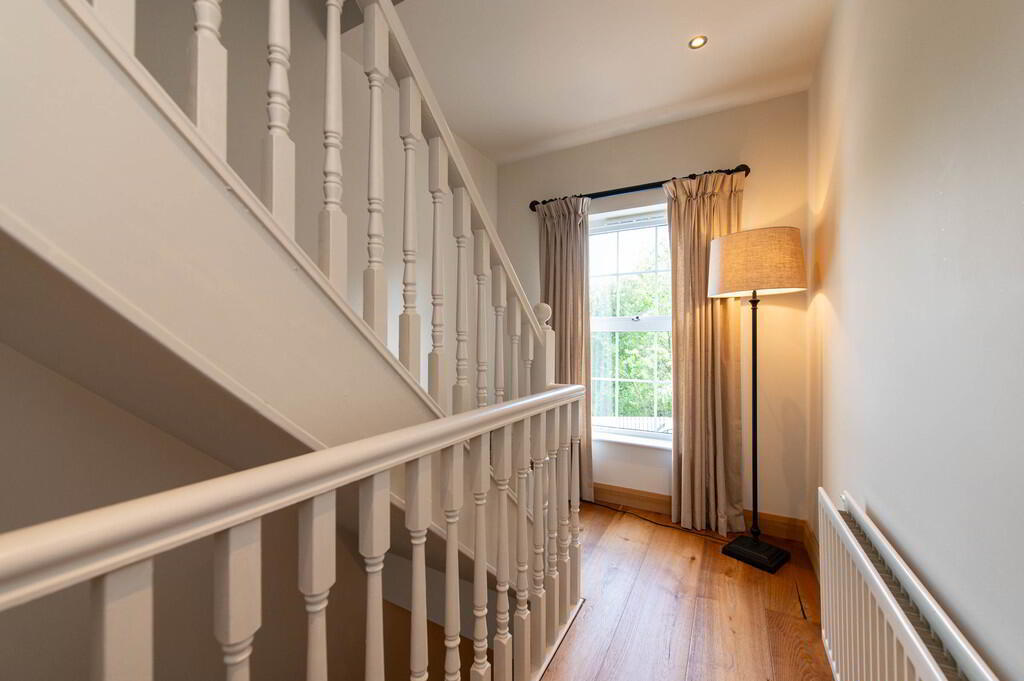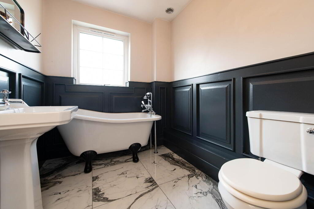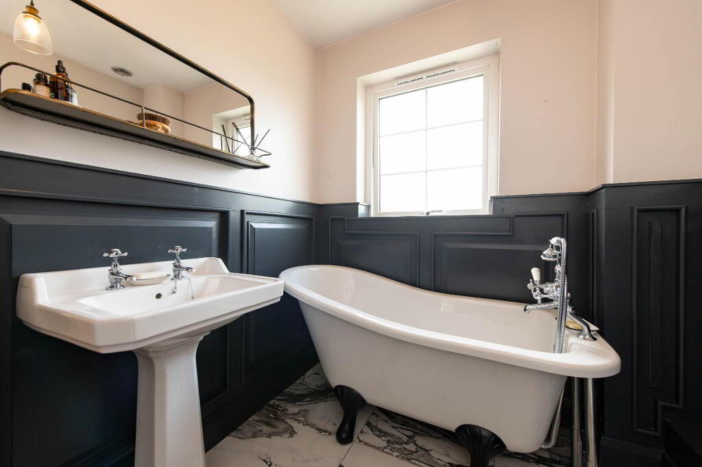 BATHROOM Deluxe white suite comprising free standing bath, telephone hand shower, pedestal wash hand basin, low flush W/C, wall panelling, polished porcelain tiled flooring, extractor fan, underfloor heating.