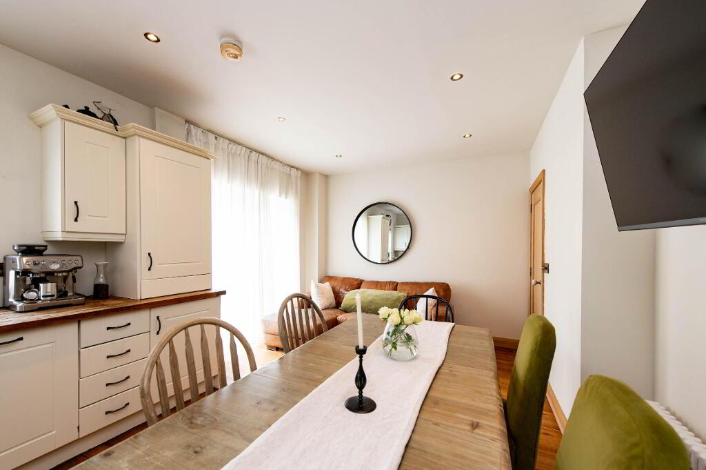 Casual dining area with French doors to rear, antique style radiator,engineered wooden flooring