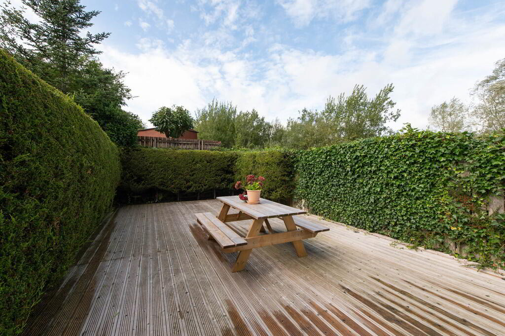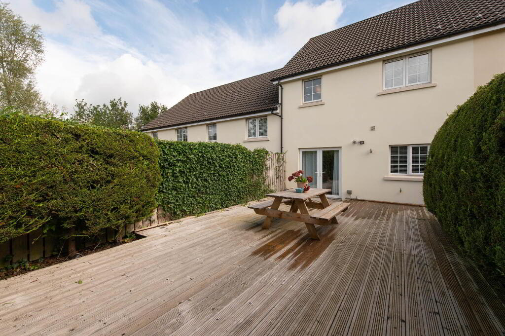 Rear: enclosed garden, in decking, shrubs, outside light and tap, external socket.