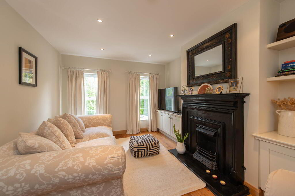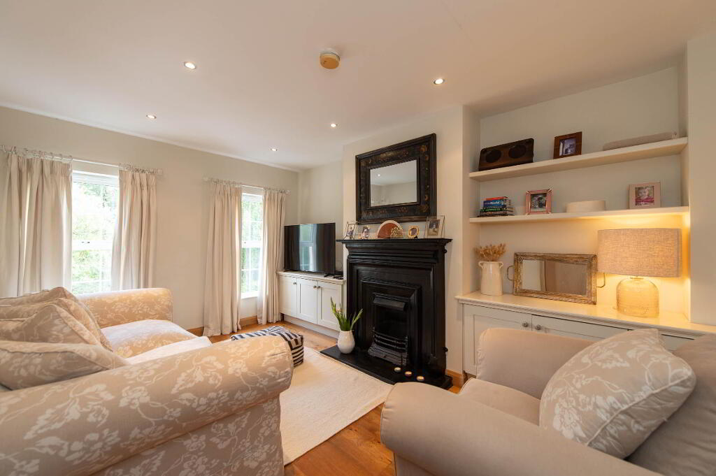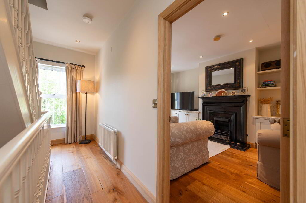 LOUNGE 15' 10" x 11' 6" (4.83m x 3.51m) Engineered wood flooring, feature cast iron fireplace, piped for gas fire, built in eave storage and shelving, downlighters