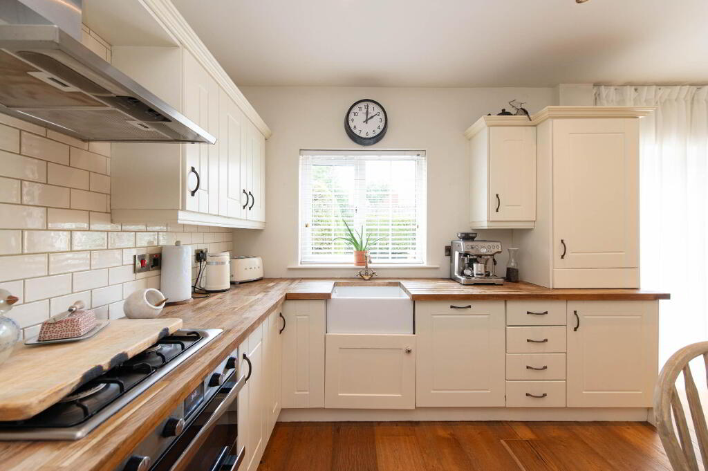 KITCHEN 18' 6" x 11' 7" (at max) or 10'9 (at min) (5.64m x 3.53m) Range of high and low level ivory shaker style units, solid wooden worksurfaces, Rangemaster Belfast sink, antique brass tap, built in stainless steel double oven and hob, stainless steel extractor fan and canopy, integrated fridge freezer, integrated dishwasher, wall tiling, downlighters.