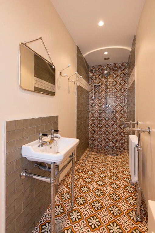WET ROOM Feature thermostatic rainfall shower, feature sink and antique style radiator, wall tiling, ceramic tiled flooring, downlighters, extractor fan