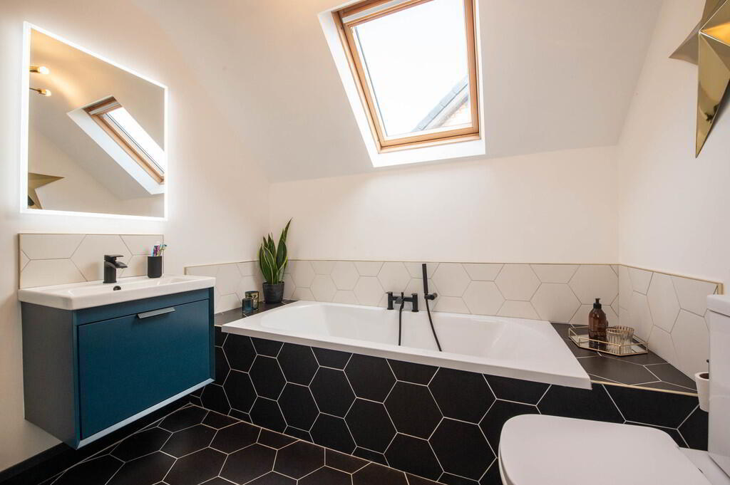BATHROOM Luxury bathroom suite, low flush w.c., wall hung vanity unit, built in bath with mixer tap and hand shower, corner glazed shower unit with rain shower, luxury tiling, ceramic tiled floor, heated towel rail