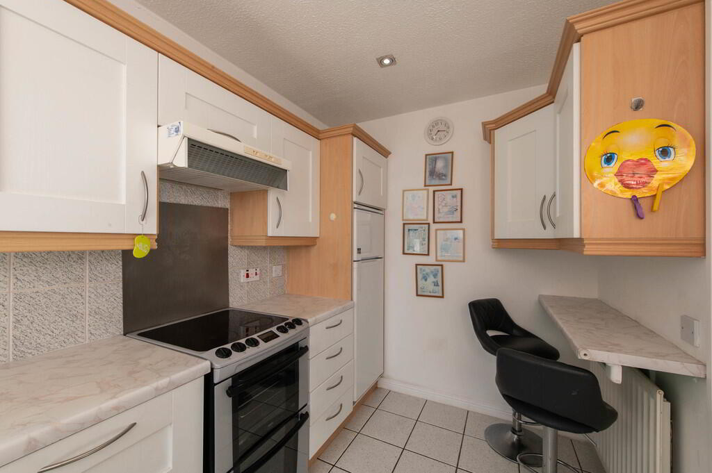 KITCHEN 11' 1" x 6' 8" (3.38m x 2.03m) Range of high and low level units, round edge worksurfaces, single drainer stainless steel sink unit with mixer tap, plumbed for washing machine, ceramic tiled flooring, extractor fan, breakfast bar, fridge freezer