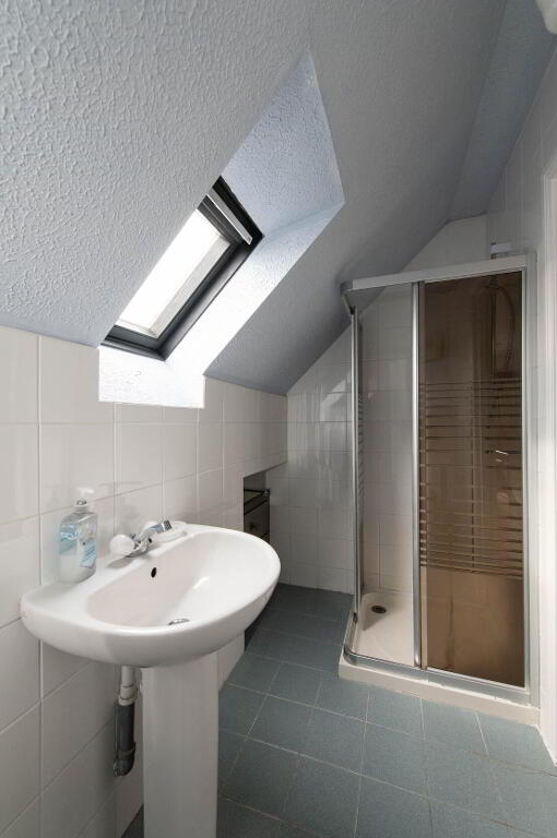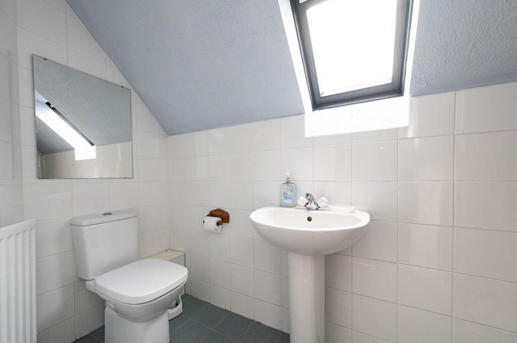 SHOWER ROOM Low flush W/C, pedestal wash hand basin, shower unit with electric shower, Velux window, heated towel rail, ceramic tiled flooring