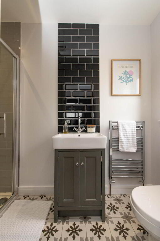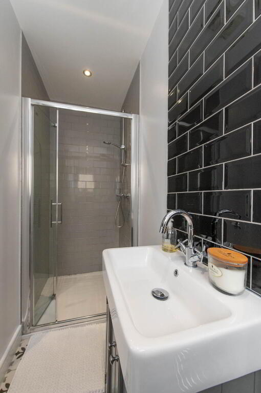 ENSUITE SHOWER ROOM Glazed shower cubicle with sliding door, vanity unit sink, low flush W/C, chrome heated towel rail, wall tiling, ceramic tiled flooring, downlighters, extractor fan