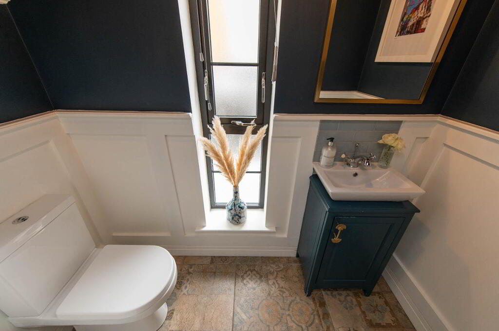 CLOAKS Low flush W/C, vanity unit sink, tiled splashback, wall panelling, ceramic tiled flooring