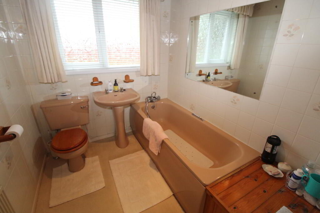 BATHROOM Coloured 3 piece suite comprising low flush W/C, pedestal wash hand basin, panelled bath with mixer tap and handheld shower attachment, wall tiling, panelled ceiling