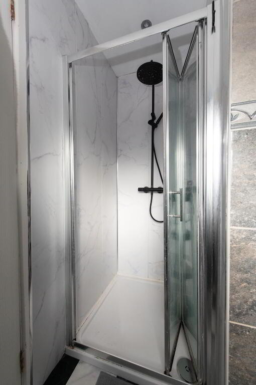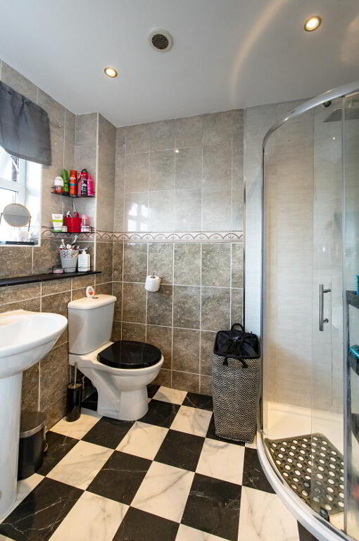 ENSUITE SHOWER ROOM Glazed shower cubicle with feature rainfall shower and separate handheld shower, low flush W/C, pedestal wash hand basin, wall tiling, downlighters extractor fan