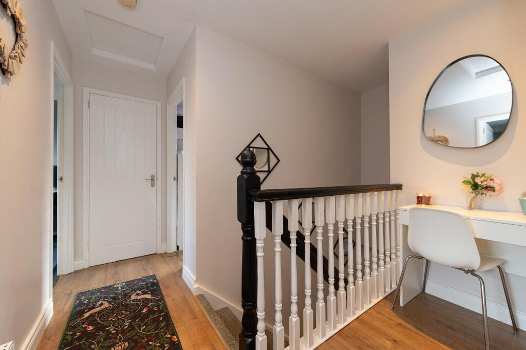 LANDING Laminate wood flooring, access to roofspace, shelved linen cupboard