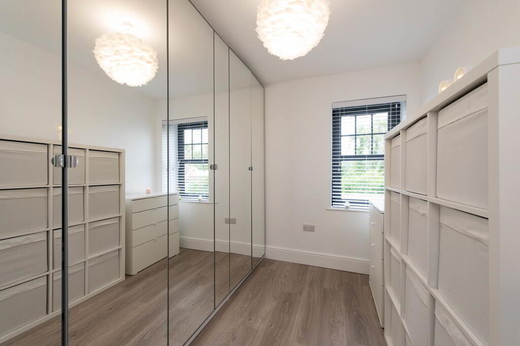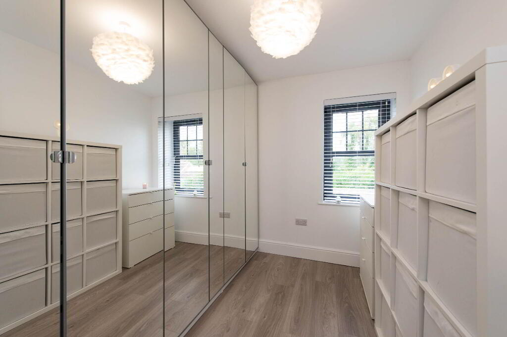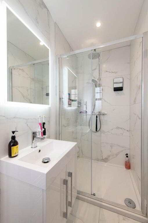 ENSUITE SHOWER ROOM Low flush W/C, vanity unit heated towel rail, luxury floor tiling, shower unit with overhead rain shower and handheld shower, extractor fan, downlighters