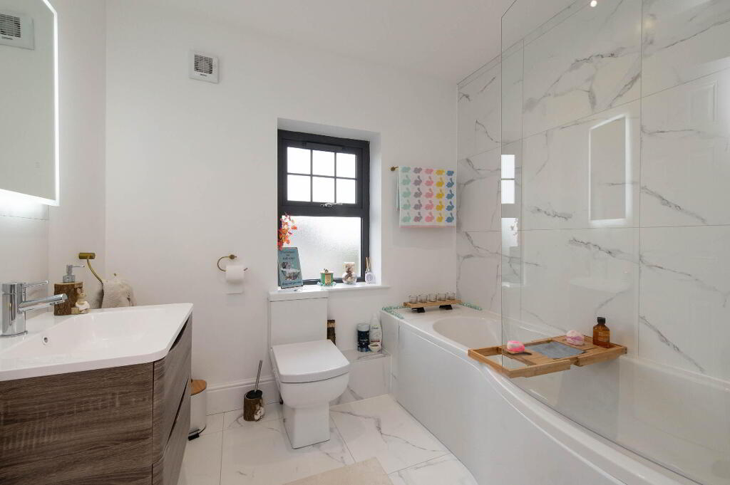 BATHROOM Modern white suite, panelled bath with mixer tap, shower with mixer tap, shower screen, wall tiling, vanity unit, low flush W/C, ceramic tiled flooring, extractor fan, downlighters