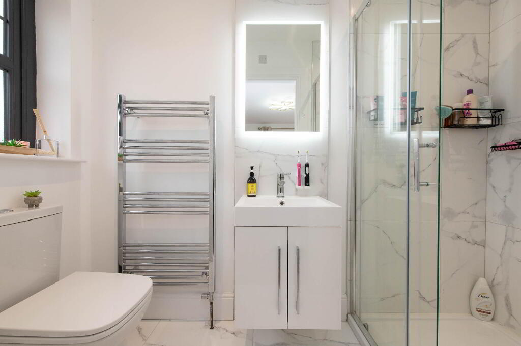 CLOAKS Low flush W/C, wash hand basin, heated towel rail, luxury floor tiling, extractor fan