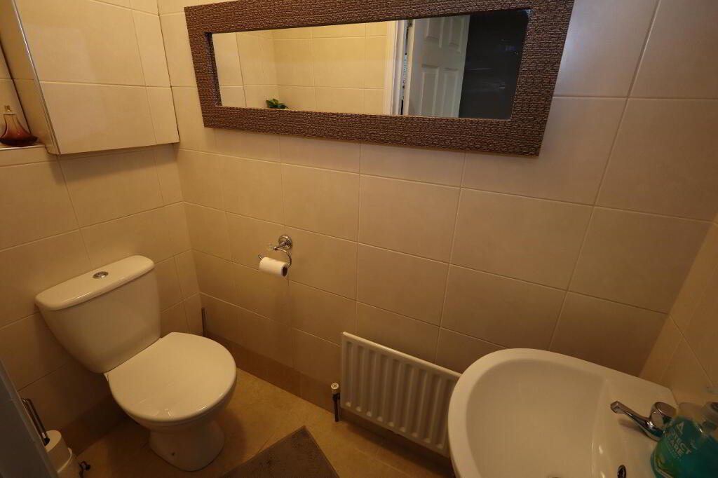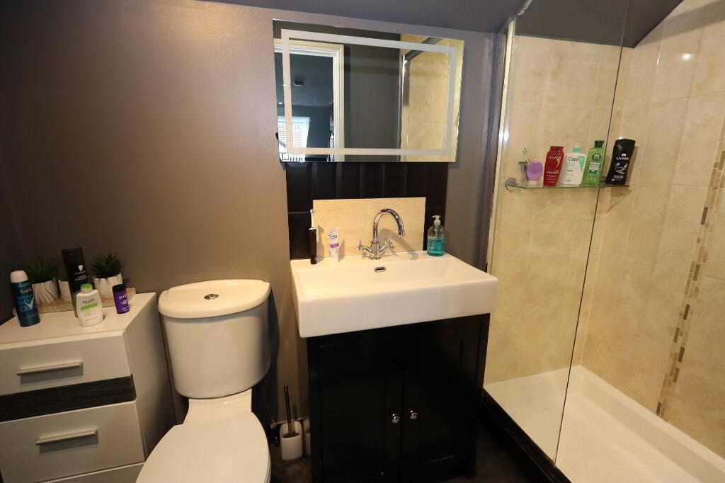 ENSUITE Low flush W/C, vanity unit with mixer tap, glazed shower screen, controlled shower, tiling, laminate wood flooring, extractor fan